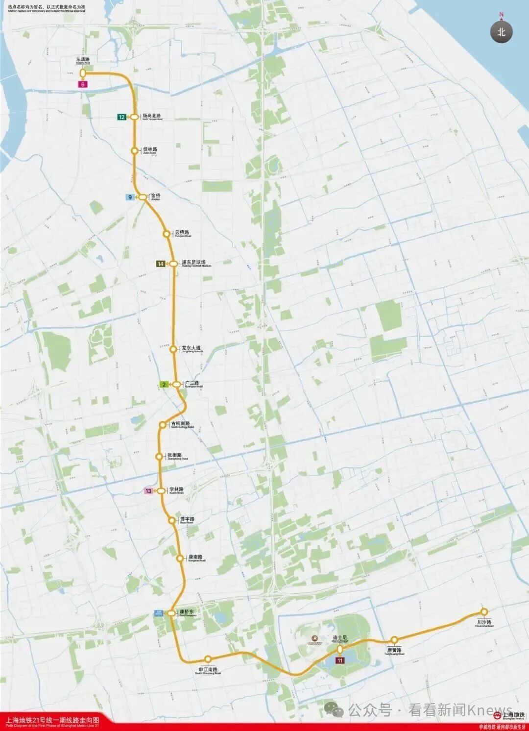 上海市轨道交通21号线一期工程全长27.964公里,线路起于上海国际旅游度假区东侧的川沙路站,终于浦东高行的东靖路站,均采用地下敷设方式,全线设18座车站。