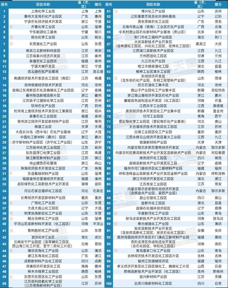 山东省入选百强的园区分别是:齐鲁化学工业区、烟台化学工业园、东营港化工产业园、济宁新材料产业园区(济宁化工产业园)、东岳氟硅材料产业园、广饶化工产业园、利津滨海新区化工产业园、桓台马桥化工产业园、垦利胜坨化工产业园、潍坊滨海化工产业园、东营市东营区化工产业园、博兴化工产业园、东明经济开发区(含东明石化产业园、东明工程塑料产业园)、平度新河化工产业园、寿光侯镇化工产业园、青岛董家口化工产业园。